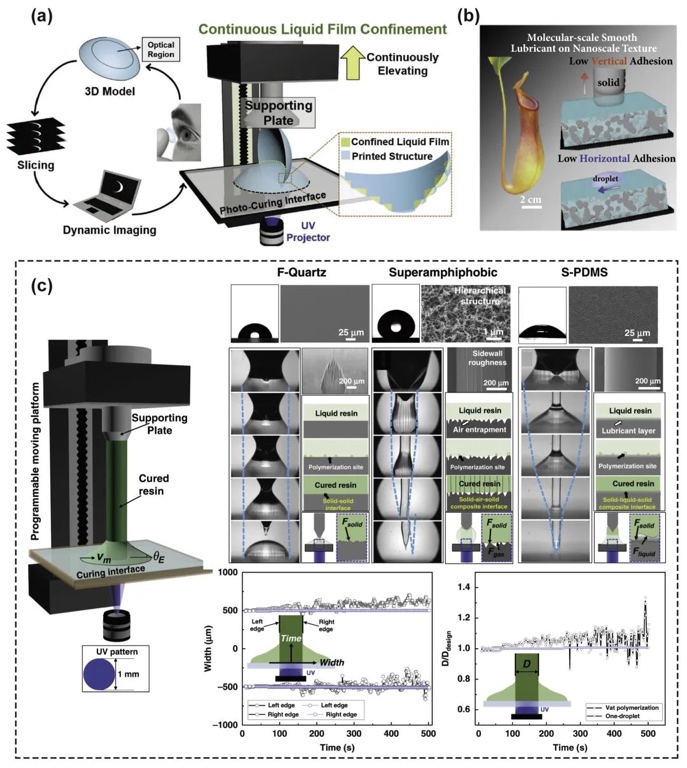 光固化技术通过调控液膜界面实现连续打印(图2a-c),仿生低黏附设计可减少材料浪费。