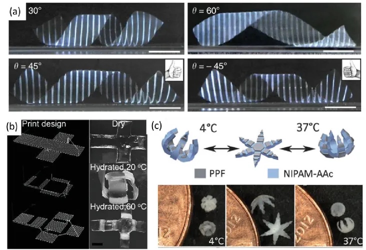 Kuang等在其综述中也总结了如图9所示的一些4D打印对外界刺激的反应情况。图 9(a)展示了图案化薄片在加热去离子水(高于聚 N - 异丙基丙烯酰胺脱水温度)及氯化钠水溶液中可进行平面与螺旋形态的可逆转变,且螺旋形态随与薄片长轴角度变化而改变。图9(b)是打印的复合水凝胶薄片含刺激响应性铰链,其可逆转变为立方体盒子,呈现由水合作用和温度变化引发的折叠 - 展开行为。图 9(c)表示了由聚富马酸丙二醇酯片段和刺激响应性的聚(N - 异丙基丙烯酰胺 - 丙烯酸)铰链制成的抓取器,高于 32℃时抓取器闭合,可在低温引入体内时抓取组织,且抓取器孔隙可用于药物持续释放 。