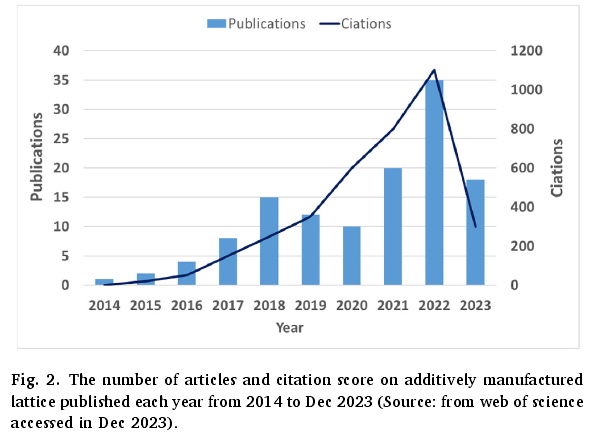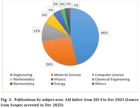 本综述论文采用的方法包括从关键工程数据库(即 Web of Science、Scopus、EbscoHost 和 ScienceDirect)系统地搜索和提取数据,重点关注 2014 年至 2023 年这 10 年的文献。搜索时使用了表 1 中列出的一组特定关键词。在去除重复文献后,共确定了 848 篇研究文章:其中 Web of Science 有 166 篇,Scopus 有 217 篇,EbscoHost 有 201 篇,ScienceDirect 有 322 篇,这些文献均于 2023 年 12 月获取。随后,应用了纳入 - 排除标准对文章进行筛选,最终得到 380 篇与增材制造用于航空航天应用的晶格结构相关的文献。这些文章根据标题、摘要、关键词、结论、材料和方法等多个部分进行了全面筛选。此外,还纳入了上述数据库之外(如表 1 中所述)的数据源的数据,以获取关于该主题的任何最新研究结果。图 2 和图 3 展示了 2014 年至 2023 年 12 月发表的关于增材制造晶格结构的文章数量、引用分数以及按学科领域的分布情况,表明在搜索期间该领域的研究呈上升趋势,也说明了增材制造晶格结构研发的重要性日益增加。