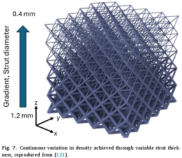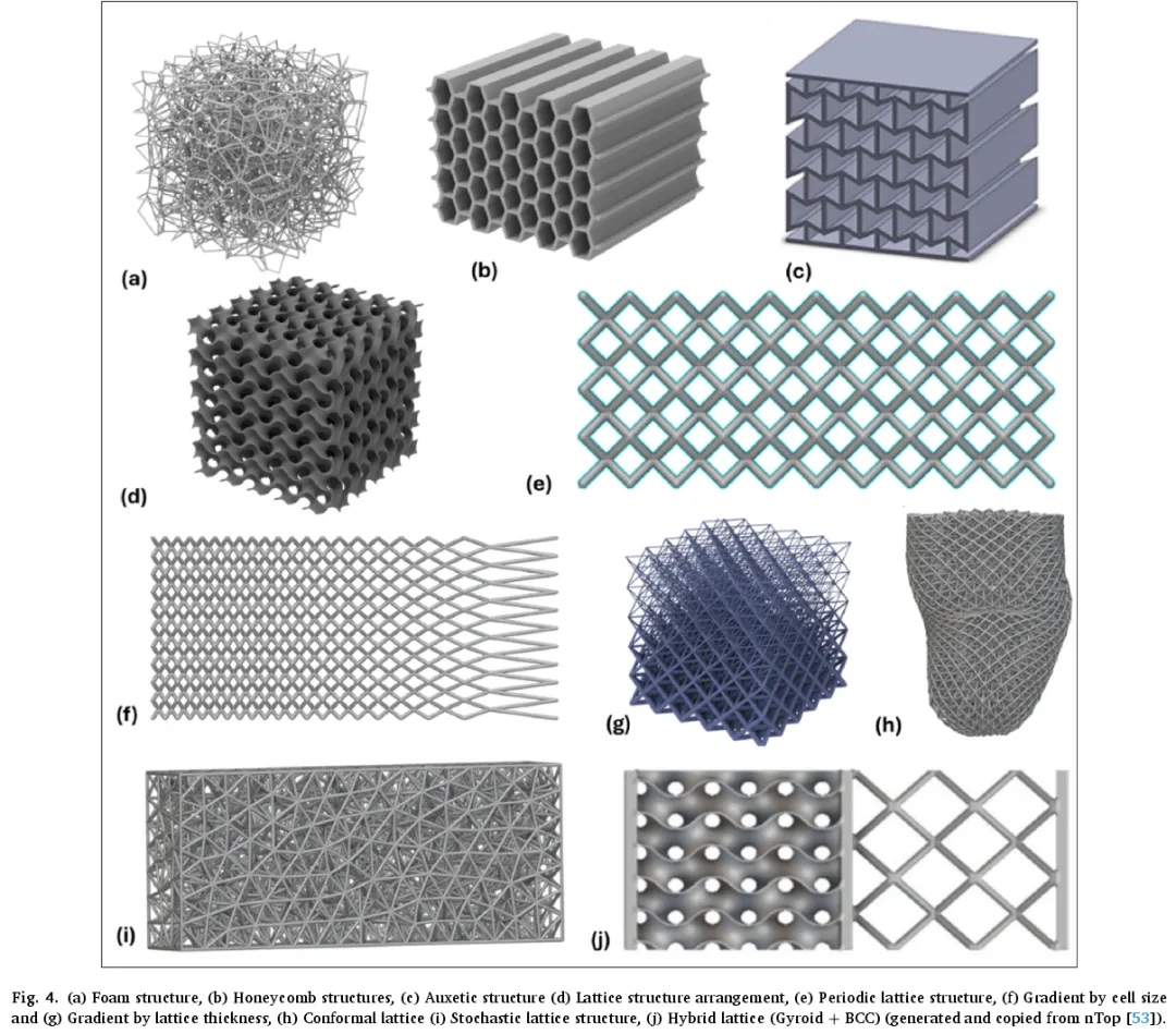 共形晶格结构的单元胞在长度和形状上以非均匀的方式变化,使复制模式能够遵循零件的边界(图 4h)。此外,随机模式(也称为随机晶格结构)的单元胞或支柱以周期性模式排列,但在大小、形状和取向上存在随机变化(图 4i),不应将其与随机泡沫(图 4a)混淆,随机泡沫由不规则形状的单元胞或空隙随机分布在固体基质中组成。另一类晶格结构是混合晶格结构,其中排列了不同类型的单元胞以获得特定的性能(如图 4j 所示)。