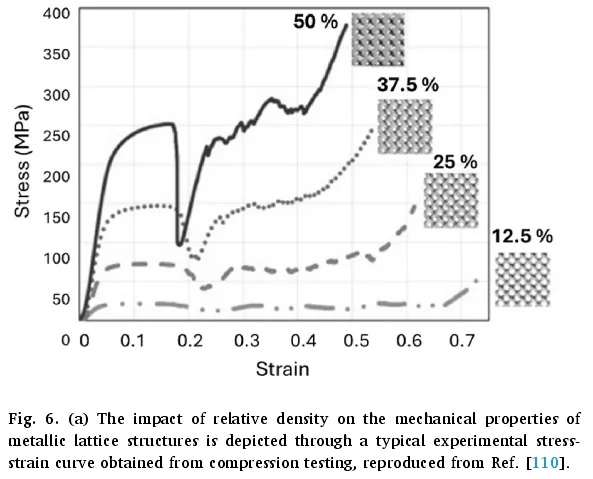 此外,对具有不同打印密度的增材制造碳纤维长丝进行了实验研究。结果表明,随着弹性模量和极限拉伸强度的提高,其机械性能更好,但代价是生产时间更长和重量增加。简而言之,较高的相对密度通常会提高强度,但也会增加重量,因此需要找到最佳的密度平衡。图 6 展示了不同密度如何影响机械性能,较密的结构在刚度和强度方面有更明显的增加。这突出了密度与晶格性能之间的复杂关系,与阿什比和吉布森关于开孔泡沫的既定原理一致。