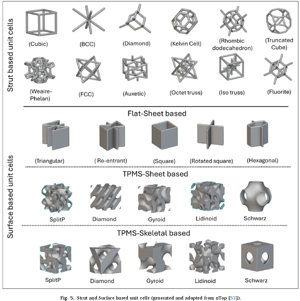 此外,文献中还概述了增材制造晶格结构中常用的不同类型单元胞拓扑结构,包括基于支柱和基于表面的晶格结构,如图 5 所示。在基于支柱的结构中,位于单元胞顶点或边缘(偶尔也在单元胞内部)的节点由通常称为支柱或梁的细直元素连接。这些单元胞具有实心和空心桁架变体,以及多种单元胞形状,包括简单立方、体心立方、面心立方和八角形桁架等(图 5)。关于基于表面的单元胞,我们可以区分基于平板的晶格和三重周期最小表面(TPMS)单元胞。基于平板的晶格由平坦的二维层组成,这些层组合在一起形成三维物体(如图 5 所示),3D 打印中常用的平面结构包括可能具有六边形或三角形单元胞的晶格。与基于梁的晶格相比,它们通常更硬,但重量更大且打印难度更高。或者,受生物启发的 TPMS 单元胞在每个点处的边界表面平均曲率为零,正受到越来越多的关注。由于其几何特征能够实现各种与表面相关的属性,如可制造性、流体渗透性以及电和热导率,它们作为功能梯度结构具有重要意义。TPMS 最早在 19 世纪由施瓦茨提出,包括原始表面和菱形表面,是数学定义的、非自相交的表面,形成周期性的三维图案并局部最小化表面积。这些表面将体积划分为单个连接的组件,可以使用基于调和函数的水平集技术创建。两种主要的 TPMS 结构是片状 TPMS 和骨架状 TPMS。在片状 TPMS 中,表面加厚形成实心结构,而在骨架状 TPMS 中,TPMS 分隔的体积被填充以创建实心结构。这些结构没有节点和曲率不连续性,减少了应力集中并提高了强度。图 5 展示了最常见的 TPMS 单元胞,如 SplitP、Gyroid 和 Diamond。