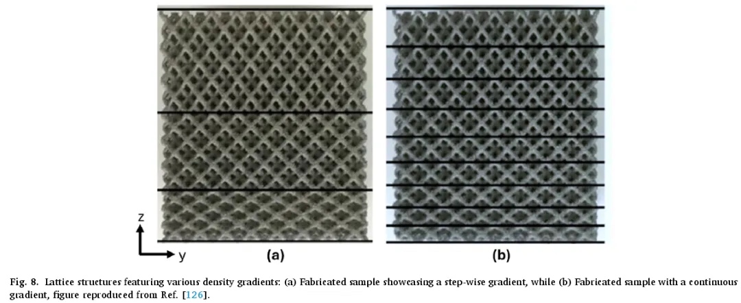 此外,梯度密度与晶格结构的力学性能之间存在很强的关系。梯度晶格结构(GLS)由于其优化的材料分布,与均匀晶格结构(ULS)相比,具有优越的力学性能,包括更高的刚度。在晶格结构中实施梯度密度已被证明可以提高结构性能,从而增加抗屈曲性和极限承载能力。通过增材制造工艺制造的晶格结构中,控制局部密度可以定制机械行为。同样,设计具有不同密度梯度的晶格结构时,可以观察到结构梯度与机械行为之间的显著关系。此外,梯度晶格结构表现出增强的扭转刚度和剪切强度,有效的材料分布影响失效机制并延迟塑性变形。诸如拓扑优化和渐近均匀化等计算方法能够优化梯度晶格结构的设计,有助于实现所需的机械性能和表现。