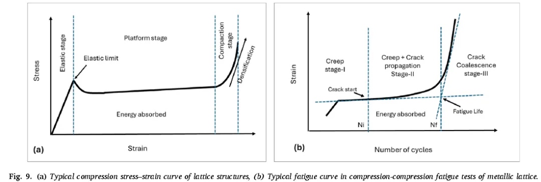 同样,由于局部缺陷和几何误差,理解晶格结构的疲劳性能具有挑战性。一般来说,疲劳强度会随着相对密度的降低而降低,尤其是在屈服应力方面。经过优化的晶格,特别是那些由高延展性的贱金属(如 Cr - Co 合金和不锈钢)制成的晶格,往往具有出色的疲劳性能。疲劳实验通常采用单轴压缩 - 压缩方式,施加的轴向载荷会随时间负向变化。尽管缺乏特定的标准化,但这种方法因其简单性而受到青睐。疲劳试样通常遵循国际标准 ISO 13314,有些还会加入端部实心板,以确保试样表面具有更好的相似性和平面度。如图 9b 所示,疲劳寿命可分为三个阶段:第一阶段涉及应力的塑性重分布和弹性安定;在第二阶段,出现棘轮效应,应变幅值恒定,平均应变上升,表明损伤开始并扩展;第三阶段,由于裂纹合并,平均应变突然上升,导致突然失效。失效循环次数由增加的曲线与拟合测试结束前平均应变最后几点的直线的交点确定。另一方面,进行弯曲测试存在实际挑战,主要源于需要采用集中载荷来模拟 3 点或 4 点弯曲条件。这种集中载荷的应用可能会使晶格材料产生压痕,因为晶格材料通常比弯曲测试中使用的滚轮或夹具更软。因此,弯曲测试主要在夹层结构上进行,在这种结构中,较硬的芯材被夹在坚固的面板之间,能够更有效地分散集中载荷并防止压痕。