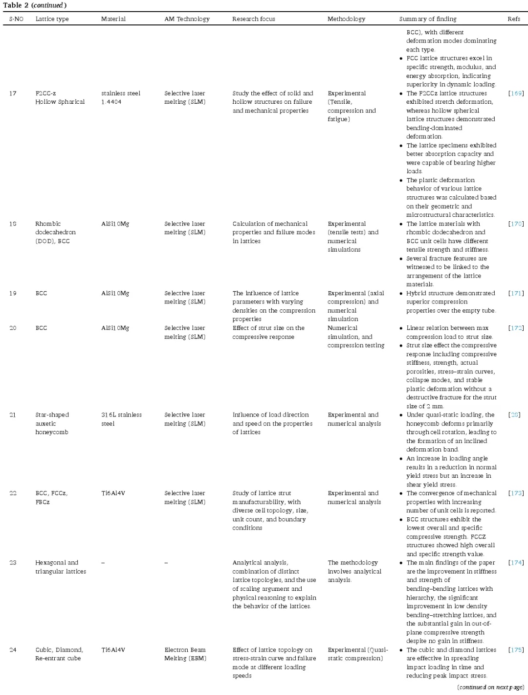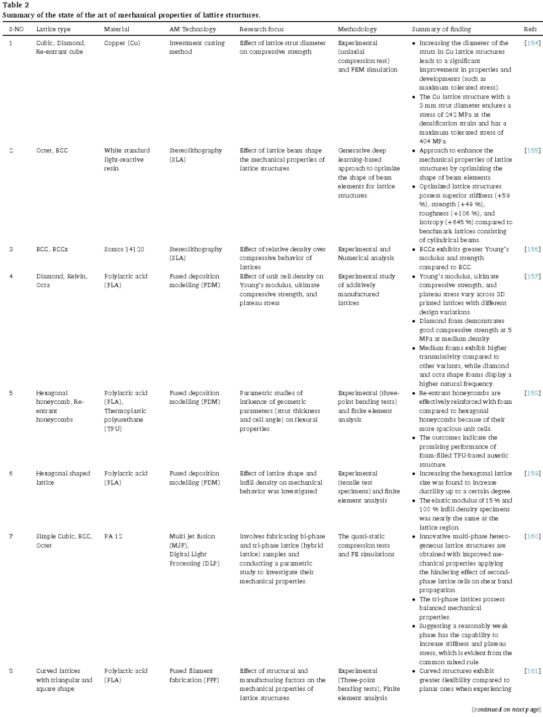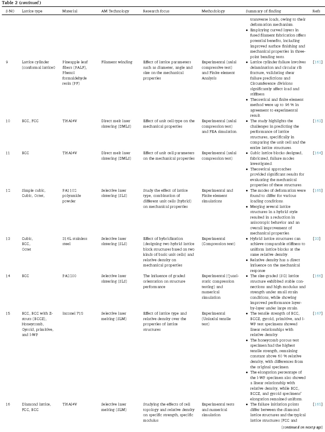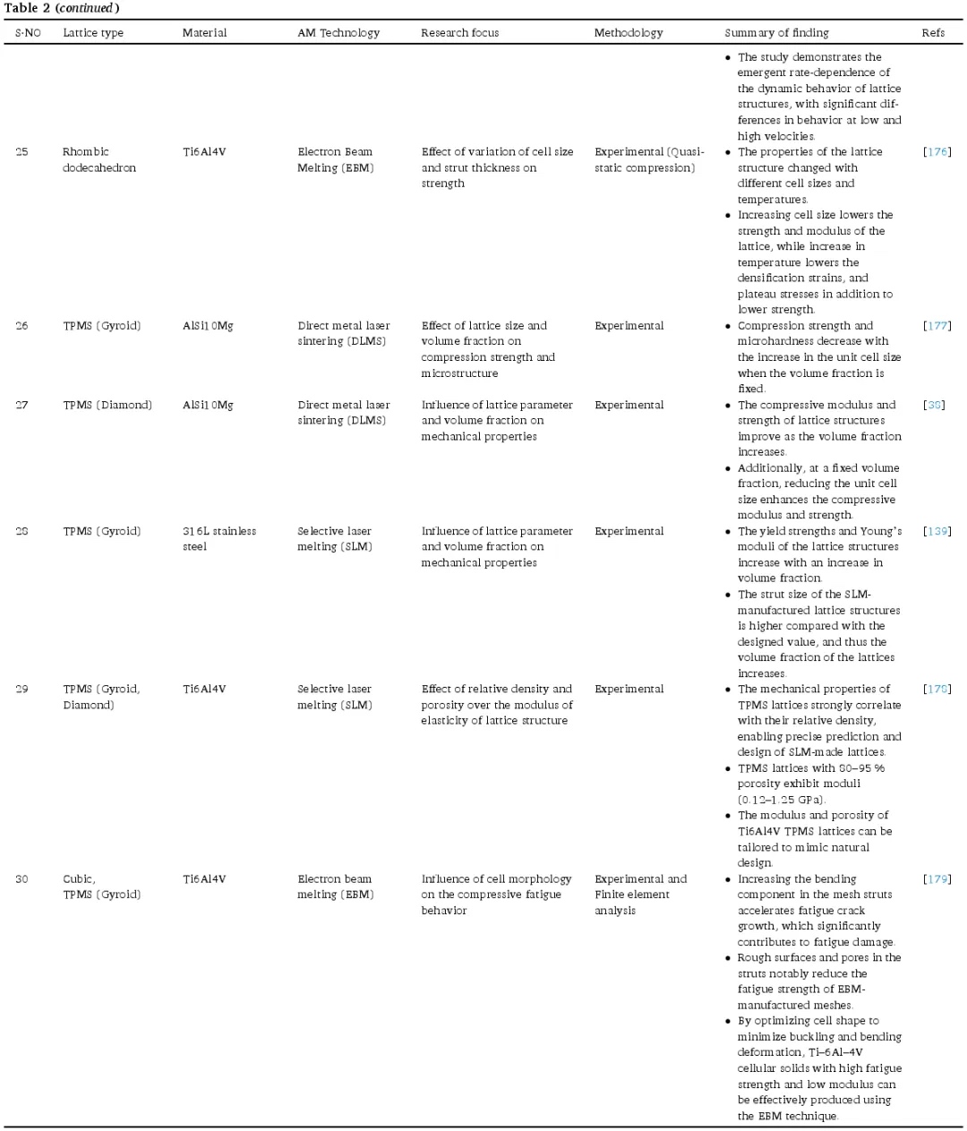 在过去几年中,一系列研究探索了晶格结构设计参数与机械性能之间的相关性。这些研究共同强调了在晶格结构机械性能研究中考虑特定设计参数的重要性。下表 2 详细总结了关键参数对晶格结构机械特性的影响。