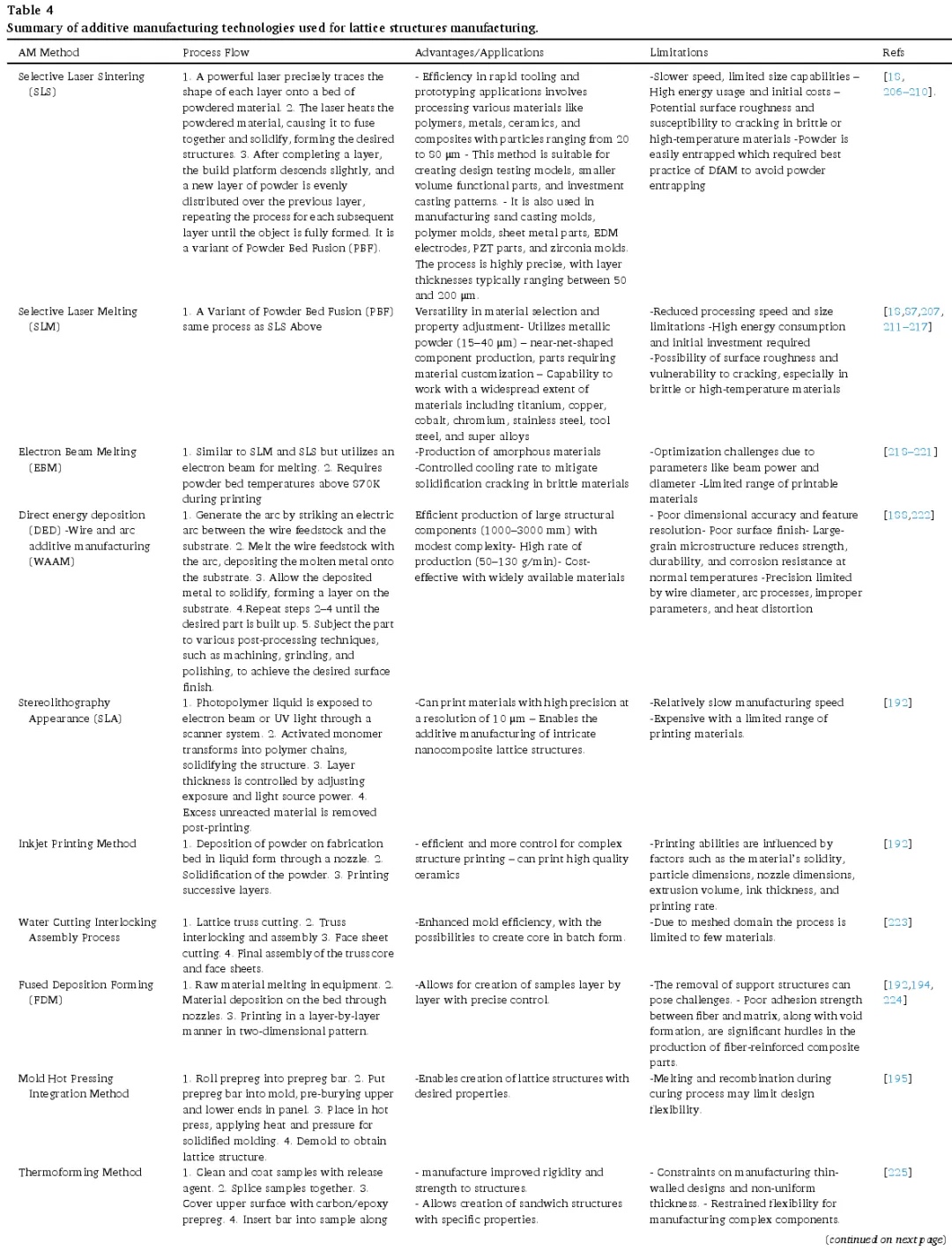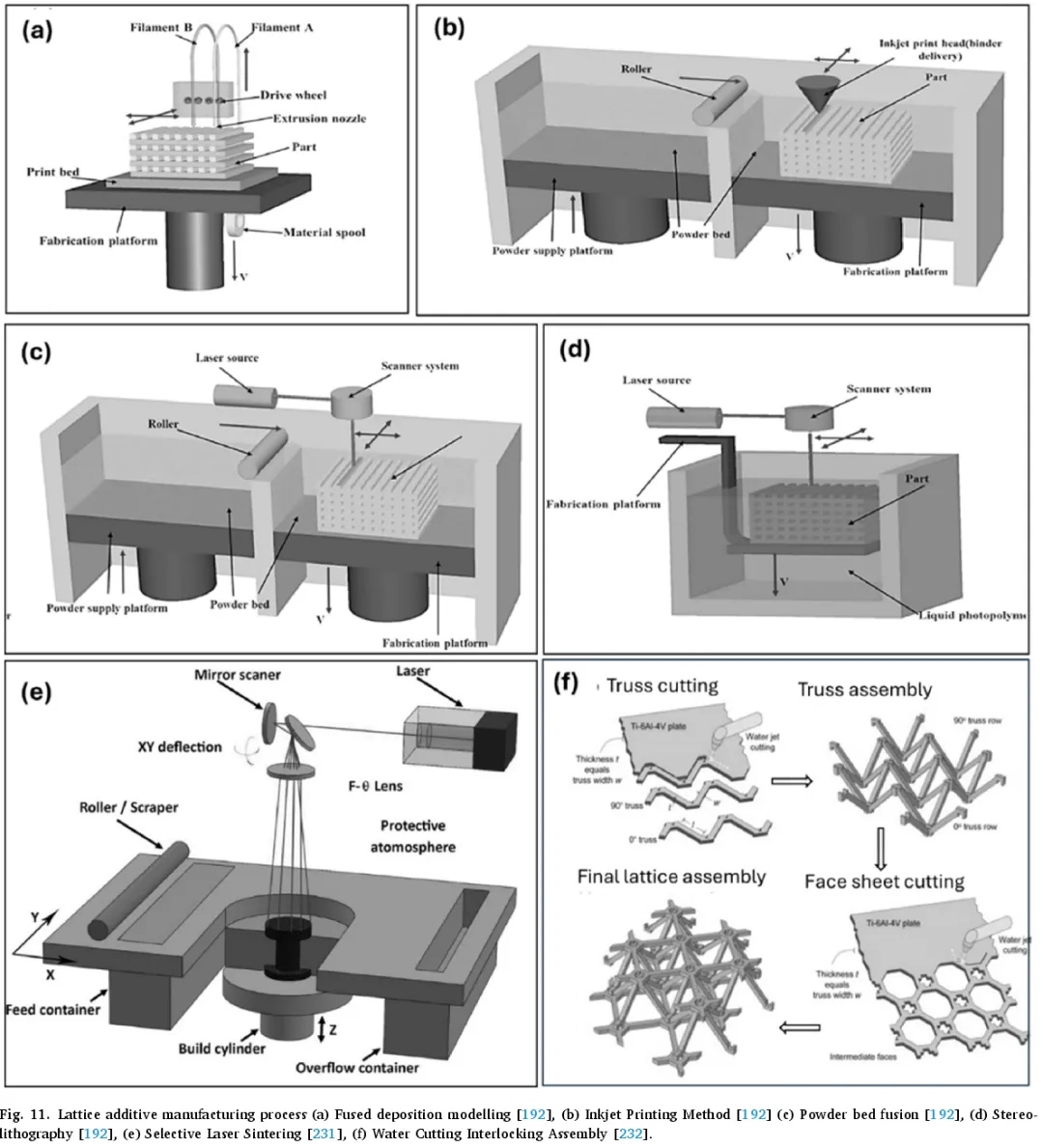 另一方面,增材制造技术已成为一种变革性的方法,能够制造出传统制造技术无法实现的具有复杂几何形状的结构(见图 11)。通过逐层堆积材料,增材制造具有设计灵活性、与多种材料(包括橡胶、金属、合金、陶瓷和纤维)的兼容性以及能源效率等显著优势。然而,该技术也存在一些挑战,例如在制造复杂几何形状时需要支撑材料,这可能导致材料浪费和后处理时间增加。该过程通常从使用 3D 扫描或 CAD 软件创建虚拟 3D 模型开始,然后将其转换为 3D 打印的标准 STL 文件格式。随后,模型被切片成二维层,并转换为 G 代码格式,以便打印机逐层沉积材料,最终得到所需的物体。用于晶格结构的各种增材制造方法各具独特的能力和优势。每种方法都有其优缺点,可根据特定应用选择最合适的方法。下表 4 详细总结了用于晶格结构制造的增材制造方法,包括其工艺流程、优点和局限性。