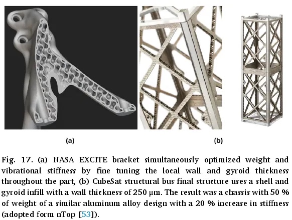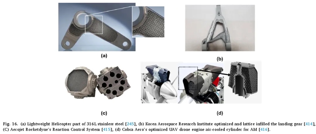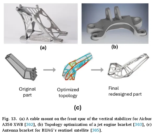 拓扑优化(TO)是一种复杂而有效的技术,旨在优化指定设计区域内材料的排列,以实现预期目标,通常可提高材料利用率。它从初始设计开始,通过将材料转移到不同位置,使最终结构与原始结构截然不同。然而,传统上,通过拓扑优化生产的复杂部件在实际生产中的可行性一直是一个重大挑战。幸运的是,增材制造的最新发展显著缓解了这一问题,使得几乎任何复杂结构的制造都成为可能。制造商已成功利用拓扑优化来生产复杂精密的零件,实现了显著的减重和零件整合。例如,拓扑优化和增材制造被用于为空客 A350 XWB 的垂直稳定器制造电缆支架(图 13a),最终形成了一个集成部件,而不是 30 个单独的零件,重量减轻了 30%,并最大限度地减少了生产和安装时间。参考文献对喷气发动机支架(图 13b)进行了拓扑优化案例研究,最终设计实现了 65% 的减重。同样,RUAG 公司哨兵卫星的天线支架(图 13c)展示了拓扑优化和增材制造的成功应用。优化后的部件刚度比最低要求高出 30% 以上,重量从 1.6 千克减至 940 克。同样,亚普等人深入研究了 3D 打印和拓扑优化在超轻型微型无人机(微型无人机)设计和生产中的应用。他们详细表征了使用选择性激光烧结制造的尼龙材料属性,并通过机械测试和有限元模拟进行了验证。利用拓扑优化设计了优化的轻质微型四轴飞行器结构,随后进行了 3D 打印并通过负载测试进行验证。此外,拓扑优化已成为航空航天结构设计的主要方法,能够实现卓越的刚度和显著的减重。