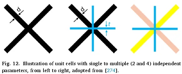 在宏观尺度优化中,每个元素都有一个单一的设计变量(体积分数或厚度)。为了扩大解空间,可以扩展单元胞的参数化。例如,图 12(中间)所示的单元胞结合了两种叠加的几何图案,即 X 形和十字形,每种图案都有自己的厚度,从而在所得的弹性张量中产生更多变化。通过为每个几何基元分配单独的厚度(如图 12(右侧)中不同颜色所示),可以进一步增加每个元素的设计变量数量。王展示了二维和三维中具有每个宏观元素多个设计变量的优化梯度晶格结构。同样,伊梅迪格武等人使用具有七个独立参数的晶格单元进行三维优化。