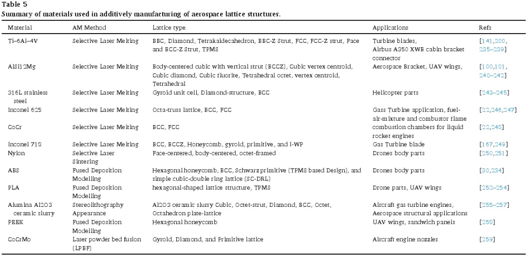 此外,文献中探索了多种用于制造晶格结构的材料,以改善其设计性能。例如,铝、钛和钢合金等金属材料通过选择性激光熔化(SLM)和选择性激光烧结(SLS)用于晶格制造。同样,聚合物和复合材料也被研究用于减轻重量和改善机械性能。这些材料的选择是基于它们与增材制造工艺的兼容性以及在各种工业应用中增强晶格结构功能和性能的潜力。下表 5 详细列出了适合增材制造晶格结构的材料,展示了每种增材制造方法的类型、使用的材料以及典型的晶格结构。