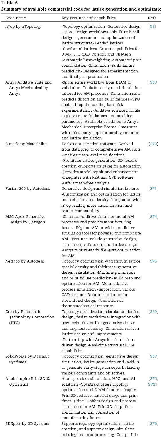 增材制造在工业制造中不断演变的角色,伴随着越来越多为晶格结构设计的软件的出现。近期的发展中,像 3DXpert for SolidWorks、nTopology、ANSYS、Creo 等工具,能够与 CAD 程序完美结合,助力特定于增材制造的设计平台。大多数商业软件包都包含多种设计优化选项,包括基于 SIMP 的拓扑优化。它们可随时用于晶格结构的设计和优化,但要以最低的计算成本获得理想的解决方案,仍需要密切关注并具备实际操作经验。下表 6 详细总结了可用于晶格结构设计和优化的不同商业代码的功能。