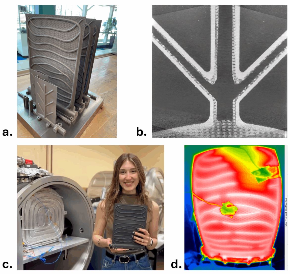 △a. 增材制造的高温钛合金热辐射器原型,内嵌分支热管网络(面板尺寸分别为75×125和200×260毫米);b. 散热器X射线CT扫描图,显示用于被动流体循环的内部多孔芯吸层;c. 宾夕法尼亚州立大学博士生Tatiana El Dannaoui正在热真空测试设施中安装散热器原型,以模拟太空环境运行;d. 热管散热器在真空室内运行的热图像。