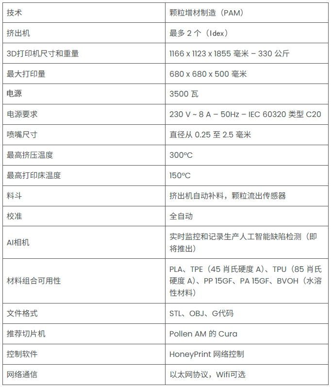 在新品发布时,Pollen AM提供了五种适用于生产应用的材料:PLA、TPE(45肖氏硬度A)、TPU(85肖氏硬度A)、PP 15GF、PA 15GF和BVOH(一种水溶性支撑材料)。为了进一步简化操作,Pam Pro预置了可以直接编程到打印机中的材料配置文件。然而,由于新设备缺少加热构建室,它的材料兼容性受到一定限制。这一设计选择是基于“尽可能降低打印机成本,以推动市场产量”的考虑。