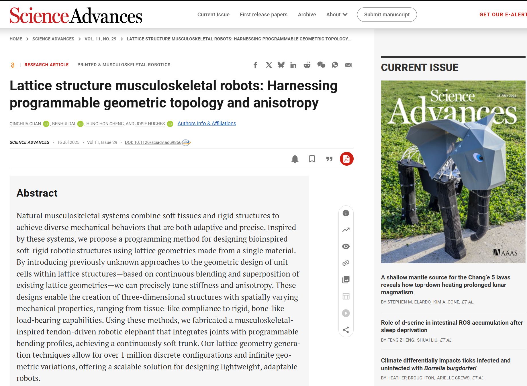 瑞士洛桑联邦理工学院(EPFL)机械工程研究所CREATE实验室的科研团队在Science Advances期刊上发表了题为Lattice structure musculoskeletal robots: Harnessing programmable geometric topology and anisotropy 《晶格结构肌肉骨骼机器人:利用可编程几何拓扑和各向异性》的研究论文,展示了一款突破性的仿象机器人。这款机器人展现出强大的多样化能力,能够用象鼻轻柔地摘取花朵,也可以有力地踢出保龄球。