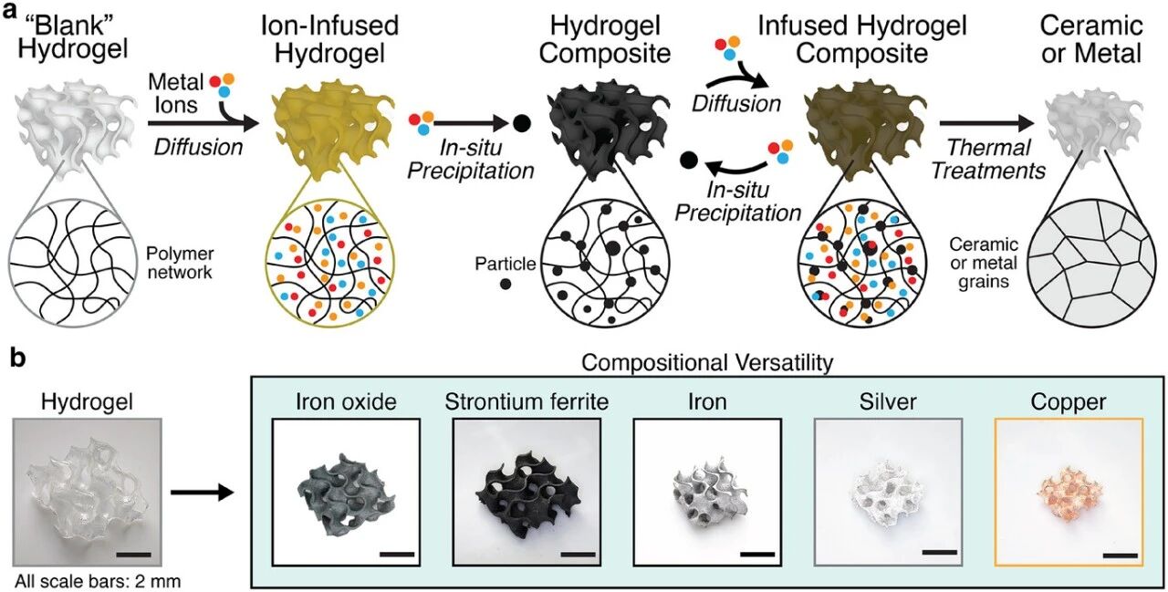 他们首先使用水凝胶打印出一个三维支架。随后,将这一“空白”结构浸入含金属盐的溶液中,使金属离子渗透并在化学反应下转化为分布均匀的金属纳米颗粒。这个过程可重复多次,最终获得金属含量极高的复合材料。