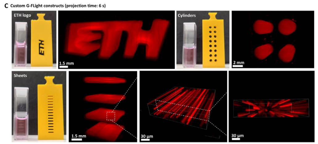 研究人员还通过荧光标记技术,打印出ETH校徽、圆柱体及薄片状结构,直观展示了G-FLight系统的高分辨率与形态可控性。借助光片显微镜和共聚焦显微镜观察,团队确认了组织内部形成了均匀分布的微米级纤维网络,这是实现功能性肌肉组织的关键特征。