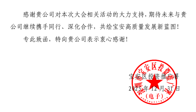 感谢信最后表示,期待未来与光印达继续携手同行、深化合作,“共绘宝安高质量发展新蓝图”。体现了宝安区政府与企业协同发展、合作共赢的明确导向。