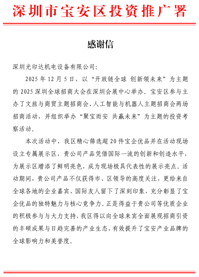 近日,深圳光印达机电设备有限公司收到来自深圳市宝安区投资推广署的感谢信。