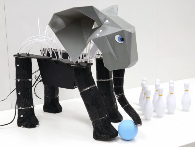 而机器人的腿部则采用SP技术创建强壮的关节和骨骼。这些关节可以在一个或两个方向上移动,使机器人能够行走、保持平衡,甚至踢出保龄球。腿部的某些部分坚硬能够承重,而其他部分则更柔软更具适应性,就像真正的大象腿一样。