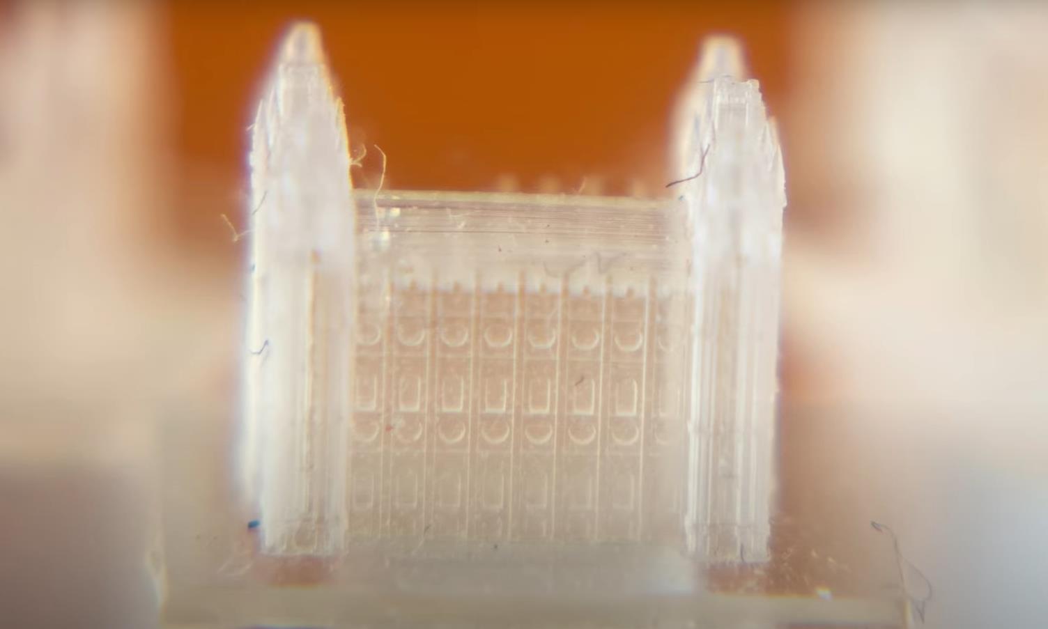 团队利用基于碳骨架材料的3D打印技术,采用紫外光聚合逐层固化成型,成功打印出包括圣地亚哥圣殿、华盛顿特区圣殿、圣乔治圣殿、普罗沃市中心圣殿、盐湖城圣殿等在内的150座微型圣殿。这些模型被精密地固定于12毫米x19毫米的微芯片底座上,同时单座模型的长度小于一粒米,淋漓尽致地展现了微纳尺度的制造精度。