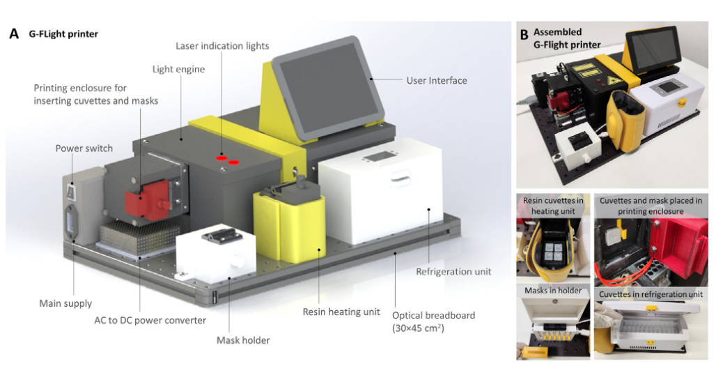 为应对太空环境的特殊挑战,团队自主研发了一套名为G-FLight(Gravity-independent Filamented Light)的便携式生物3D打印机。设备体积小巧,仅占30×45×30厘米的空间,适合搭载于飞行器或空间站内。其核心原理是利用光固化技术,将含有活体肌肉细胞的光敏生物树脂暴露于特定波长的光线中,逐层交联成型,从而构建出三维组织结构。