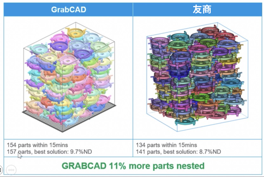实际案例:在“单一零件的大批量订单模拟”中,GrabCAD Print Pro 在 15 分钟内可完成154件排包,继续搜索后的最优解达到157件,单次构建装载数量提升约 11%。这说明其价值不只是完成排包动作本身,更在于把可用构建空间进一步转化为有效产出。